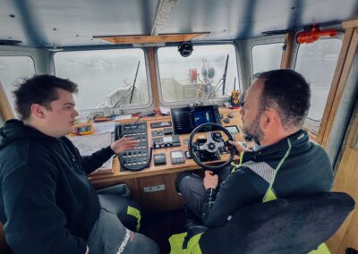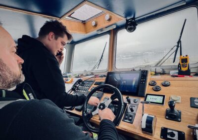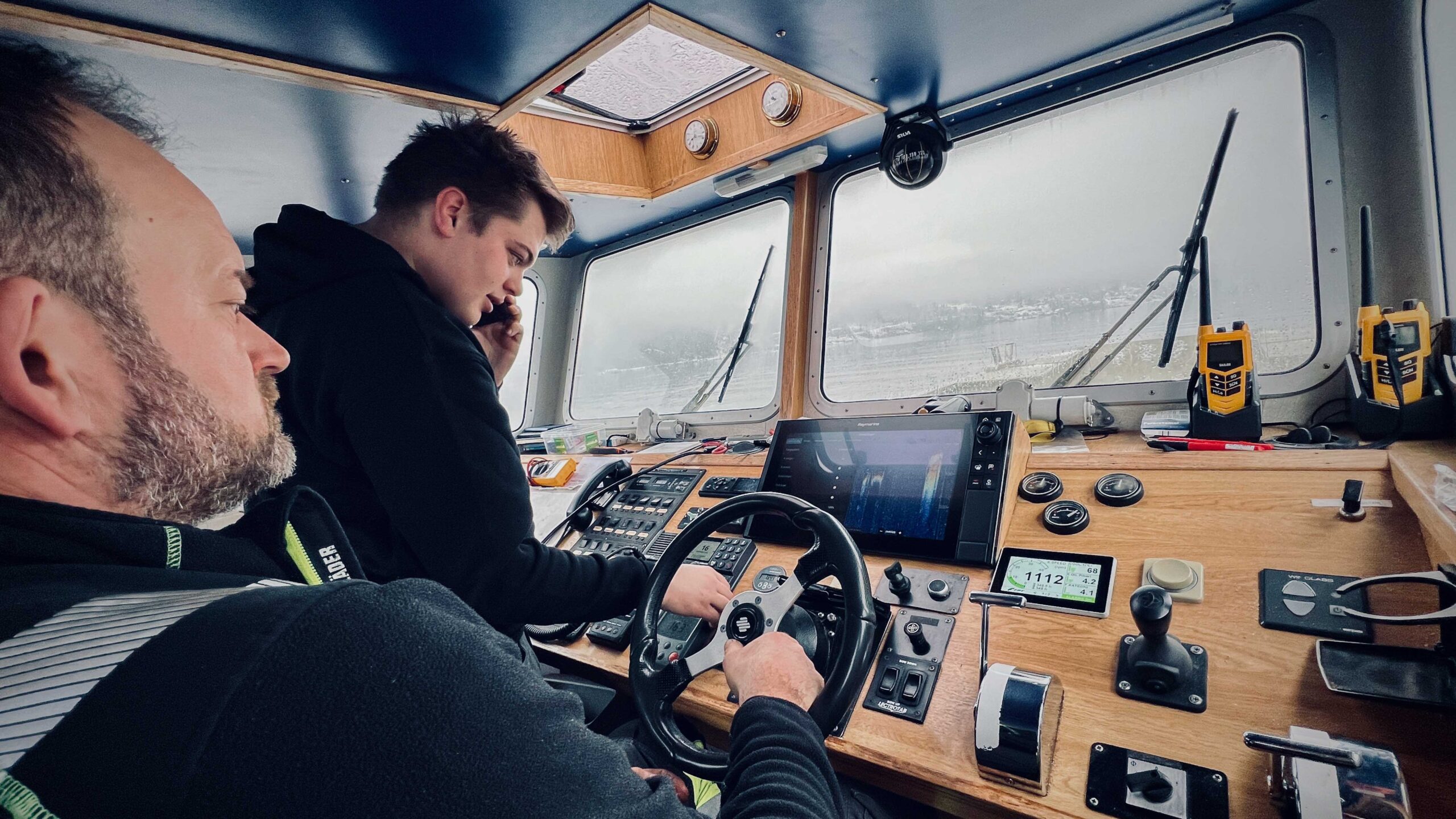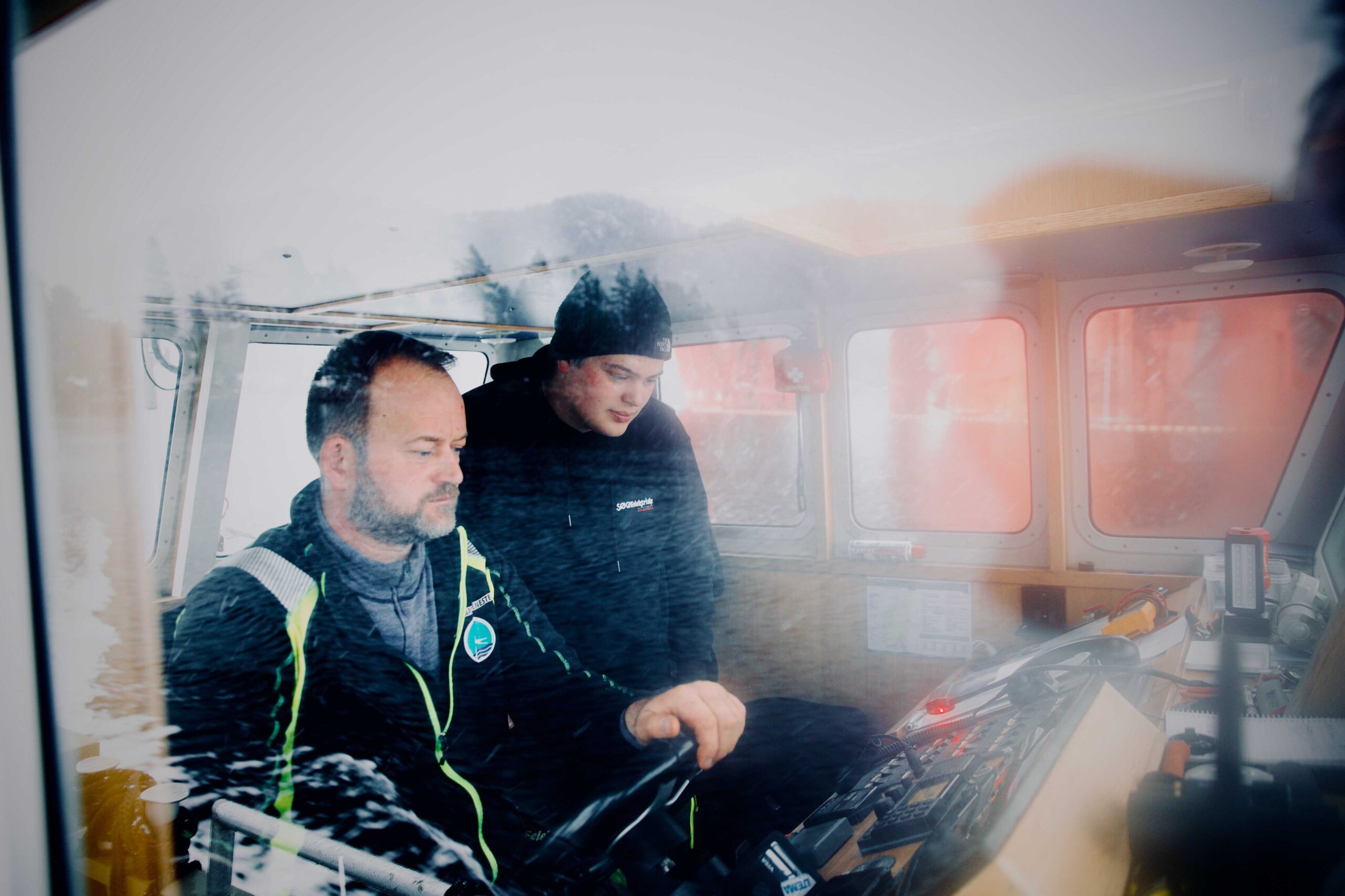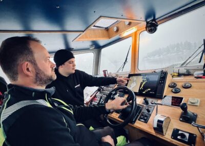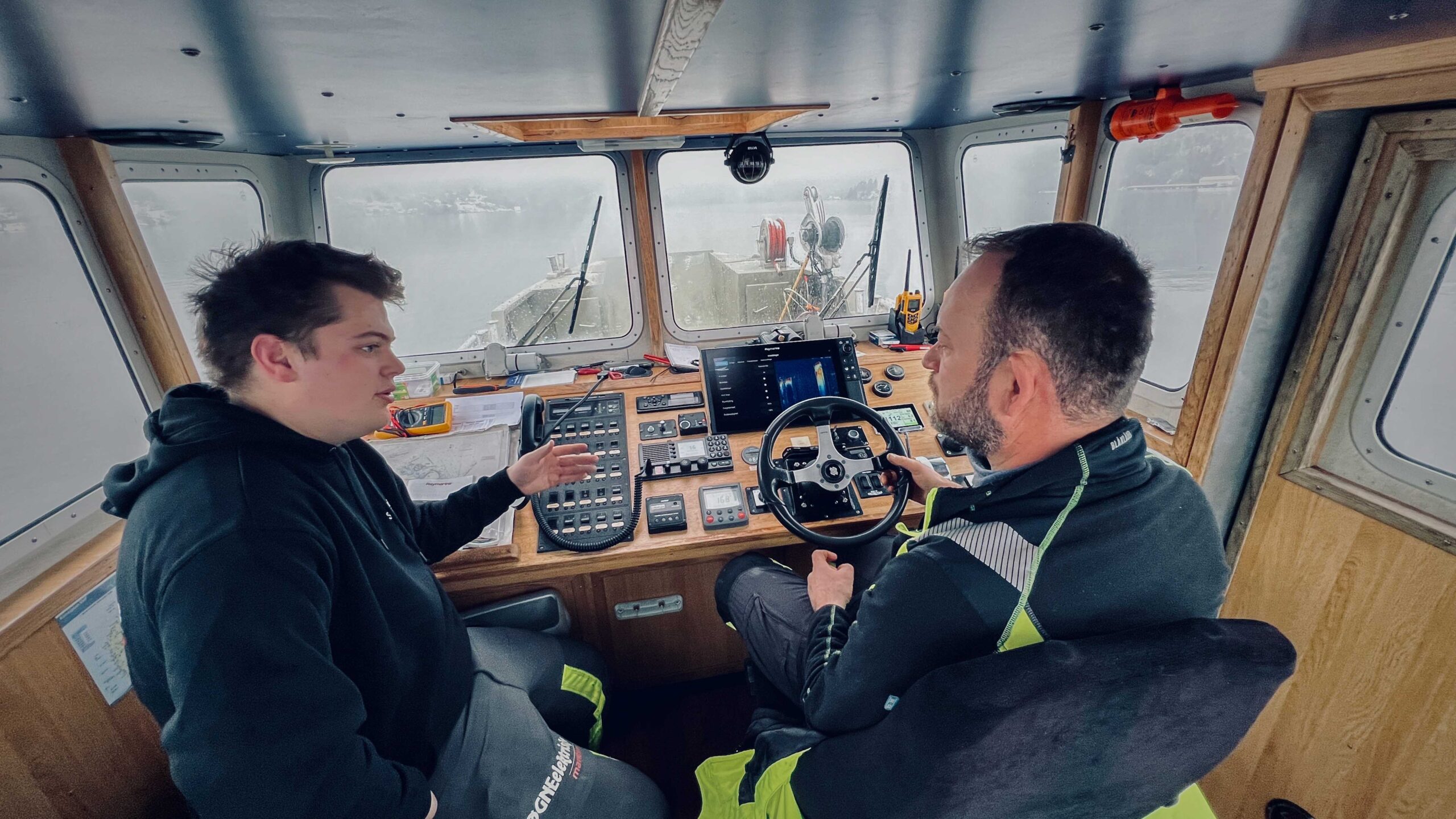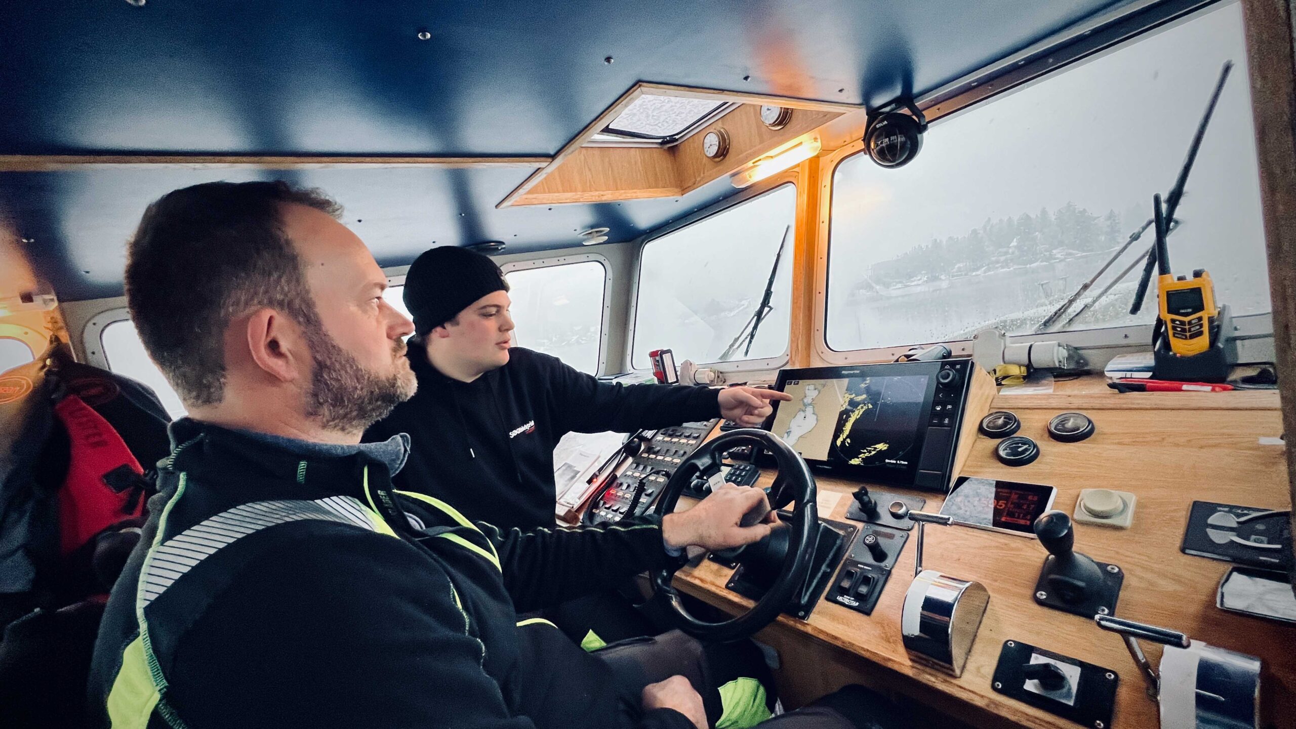 Elektrikerlærling Johan Unhammer og skipper om bord Pål Knudsen på testtur i Grisefjorden for å sjekke om radaren er riktig kalibrert.