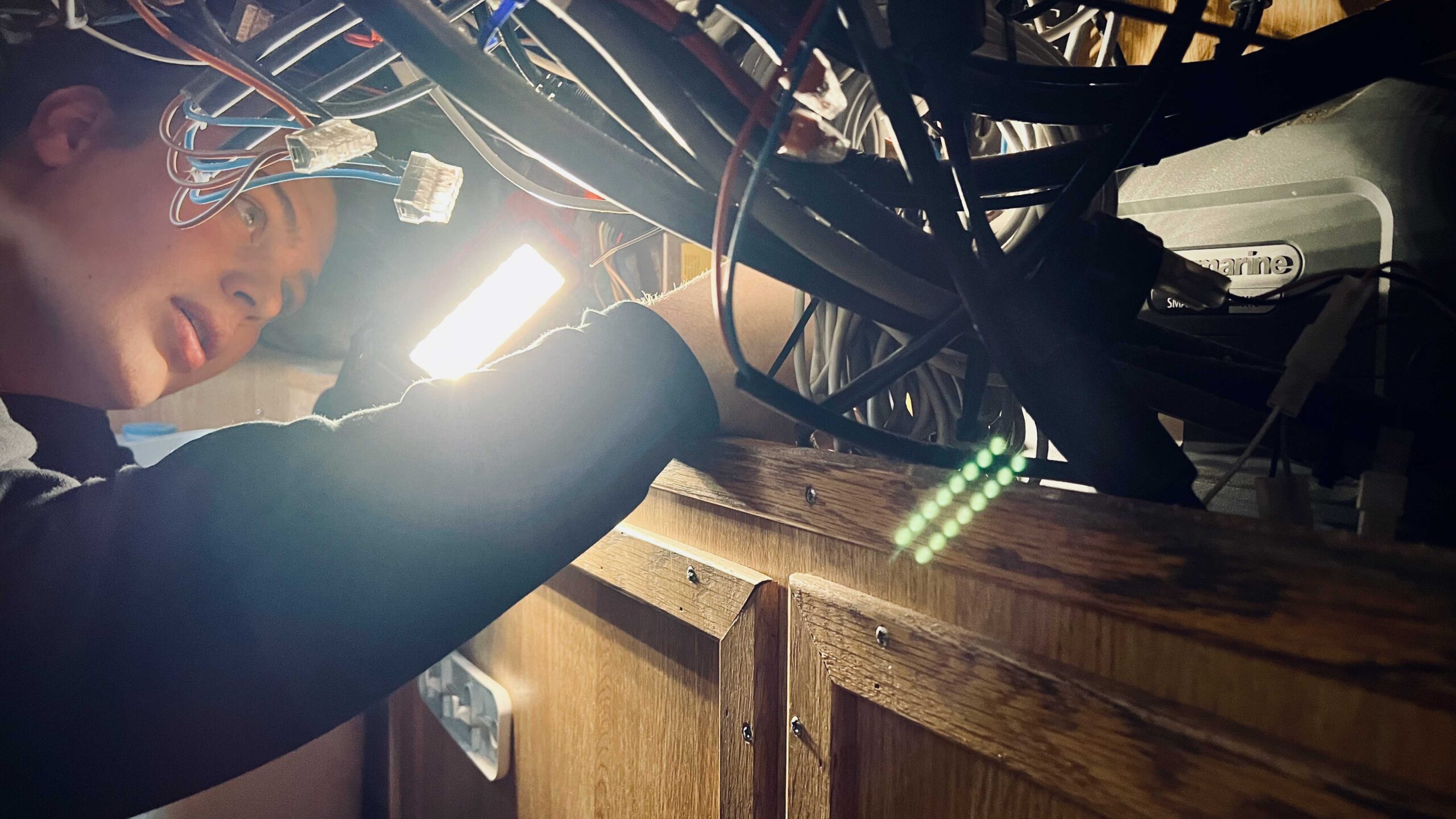 Under styrekonsollen og panelet med elektriske instrumenter ligger elektrikerlærling Johan Unhammer på alle fire og kobler ledninger.